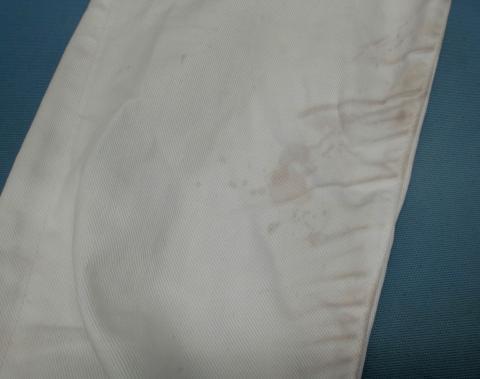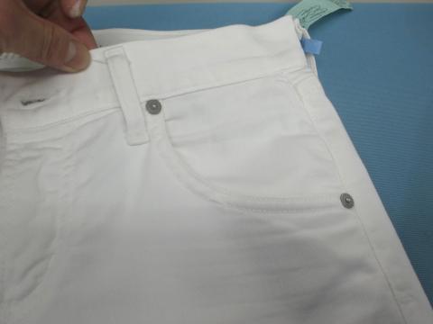 | 職人からの一言 | もう何度もご利用いただいている常連のお客様からのご依頼です。 ホワイトジーンズに赤ワインをこぼしてしまったので落としてほしいというご希望です。 ストレッチ素材ながら綿がメインなので赤ワインを落とすことは容易いのですが、白いパンツなので全体的にも擦れ汚れ等出ており、どこまで落とせるかがポイントになります。 因みに擦れ汚れや、泥汚れなんかは漂白ではほとんど変わらなく全て部分的な処置が必要になるので今回のケースもかなり手間のかかる処置! でもホワイトジーンズなどはしっかり手間をかければここまで真っ白に出来るんですよ! これなら気持ちよくお召しいただけますよね! | ||